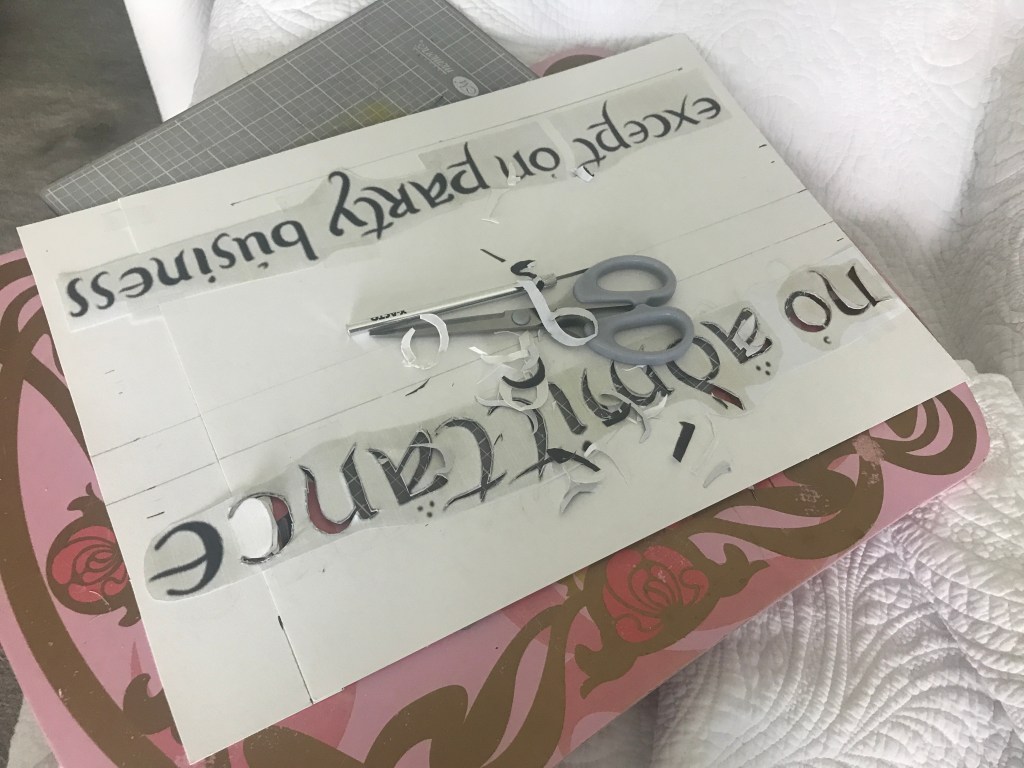 To accomplish this, I measured the space on the board and pieced together two pieces of card stock to make the stencil the same size as the area I wanted to work in. After that, I isolated the words from the pictures I found online from the movie and printed them on regular paper in various sizes. This was because I had to get it to fit the stencil just right. All this was done in Paint 3D and in my printer settings. I’m sure there is a far easier way to do this, but this is my tried and tested method and I rather enjoy making things more complicated than they need to be.