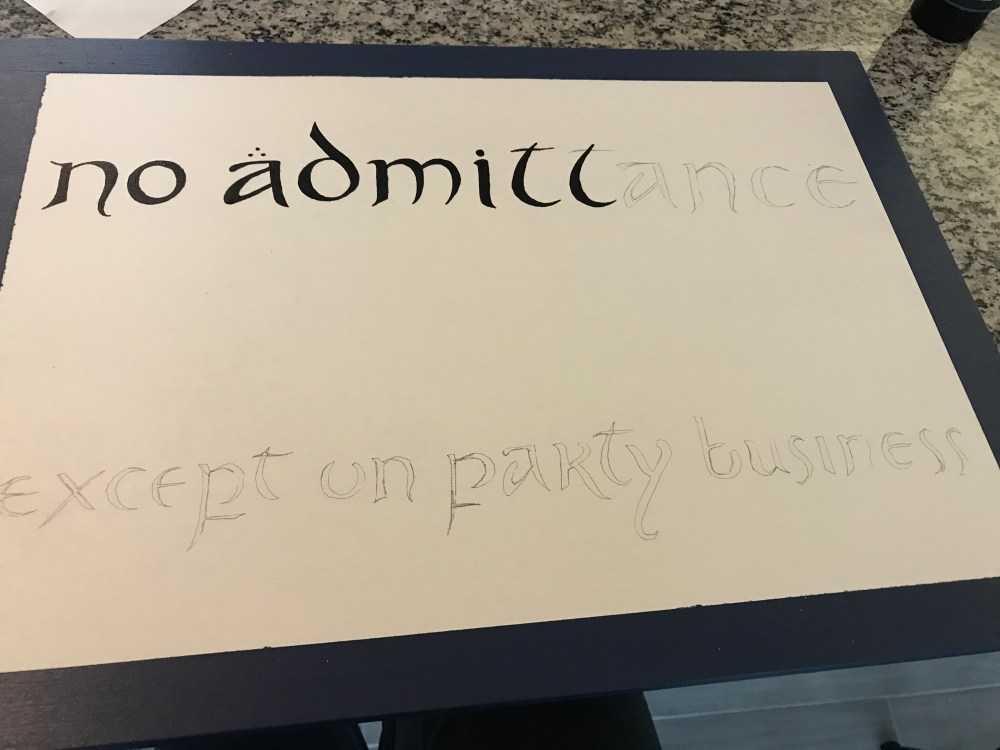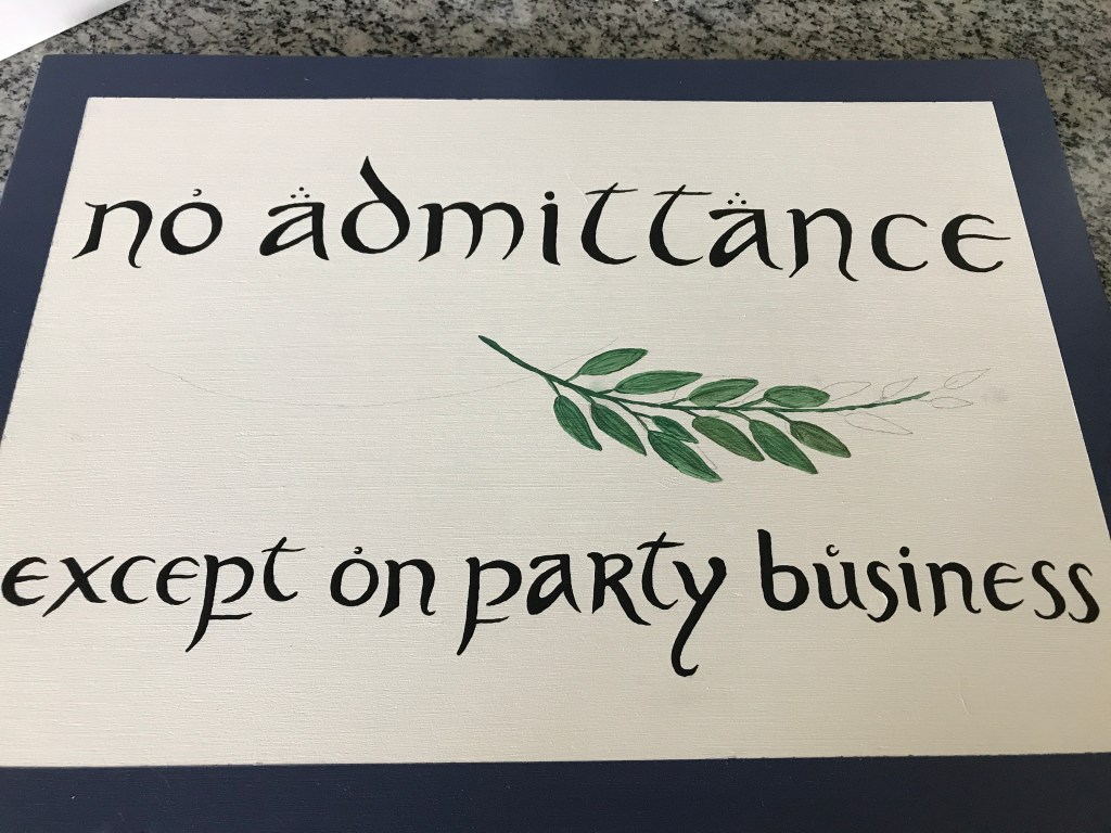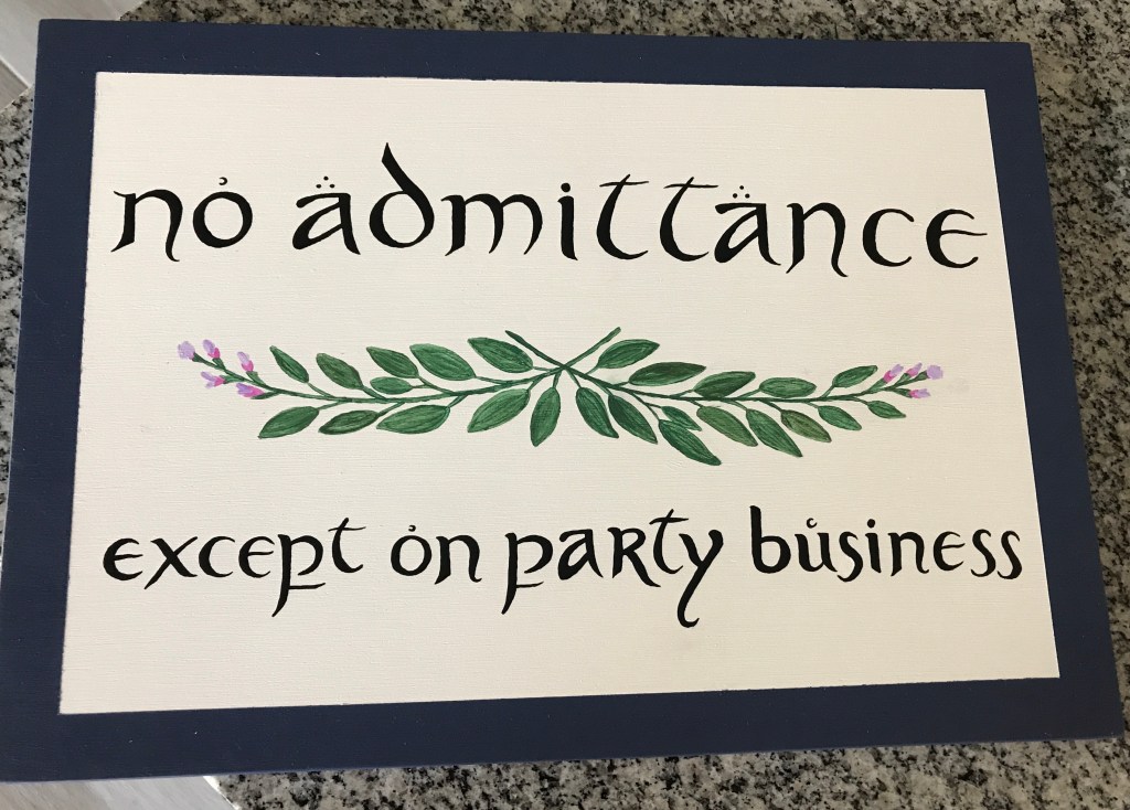 One of the things I love most about Bilbo is his longing for adventure, yet still wanting to keep his neighbors at bay. One of my favorite opening scenes is Frodo nailing a sign to the front gate that says “no admittance except on party business.” How fitting a phrase is that for social distancing? No one enters my house unless it’s for a party that most definitely isn’t happening any time soon, if ever. Thus, I got my inspiration for quarantine crafting. Seeing as I don’t have a front gate, though, I thought I’d make do with a front door wreath/sign hybrid.